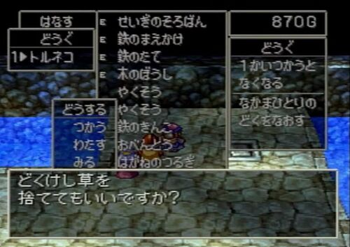 今やドラクエの持ち物といえば、必ず袋があるためにほぼほぼ制限はないといえる。 同一アイテムを99個まで収納できる四次元袋のおかげで、目一杯やくそうを持ち込んでダンジョンに潜り込んだとしても宝箱の中身を問題なく手に入れることが出来る。